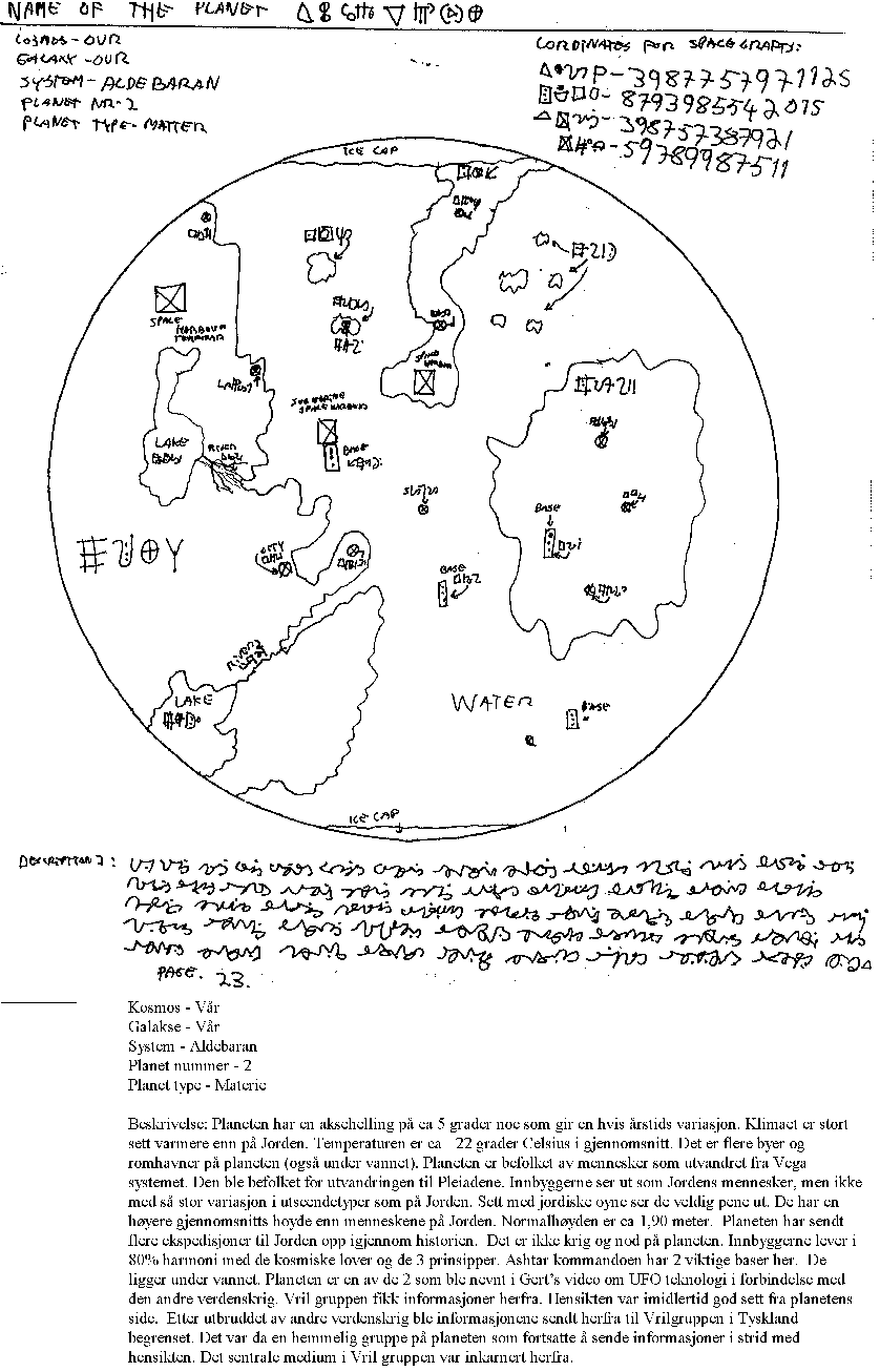 | Beskrivelse: Planeten har en aksehelling på ca 5 grader noe som gir en hvis årstids variasjon.Klimaet er stort sett varmere enn på Jorden.Temperaturen er ca +22 grader Celsisus i gjenommsnitt.Det er flere byer og romhavner på planeten (også under vannet).Planeten er befolket av mennesker som utvandret fra Vega systemet.Den ble befolket før utvandringen til Pleiadene.Innbyggerne ser ut som Jordens mennesker,men ikke med så stor variasjon i utseendetyper som på Jorden.Sett med jordiske øyne ser de veldig pene ut.De har en høyere gjennomsnitts høyde enn menneskene på Jorden.Normalhøyden er ca 1,90 meter. Planeten har sendt flere ekspedisjoner til Jorden opp igjennom historien. Det er ikke krig og nød på planeten.Innbyggerne lever i 80% harmoni med de kosmiske lover og de 3 prinsipper.Ashtar kommandoen har 2 viktige baser her. De ligger under vannet.Planeten er en av de 2 som ble nevnt i Gert's video om UFO teknologi i forbindelse med den andre verdenskrig.Vril gruppen fikk informasjoner herfra.Hensikten var imidlertid god sett fra planetens side. Etter utbruddet av andre verdenskrig ble innformasjonene sendt herfra til Vrilgruppen i Tyskland begrenset.Det var da en hemmelig gruppe på planeten som fortsatte å sende informasjoner i strid med hensikten.Det sentrale medium i Vril gruppen var innkarnert herfra. |